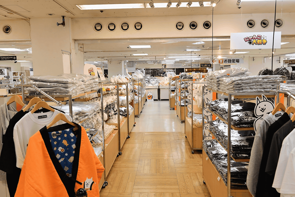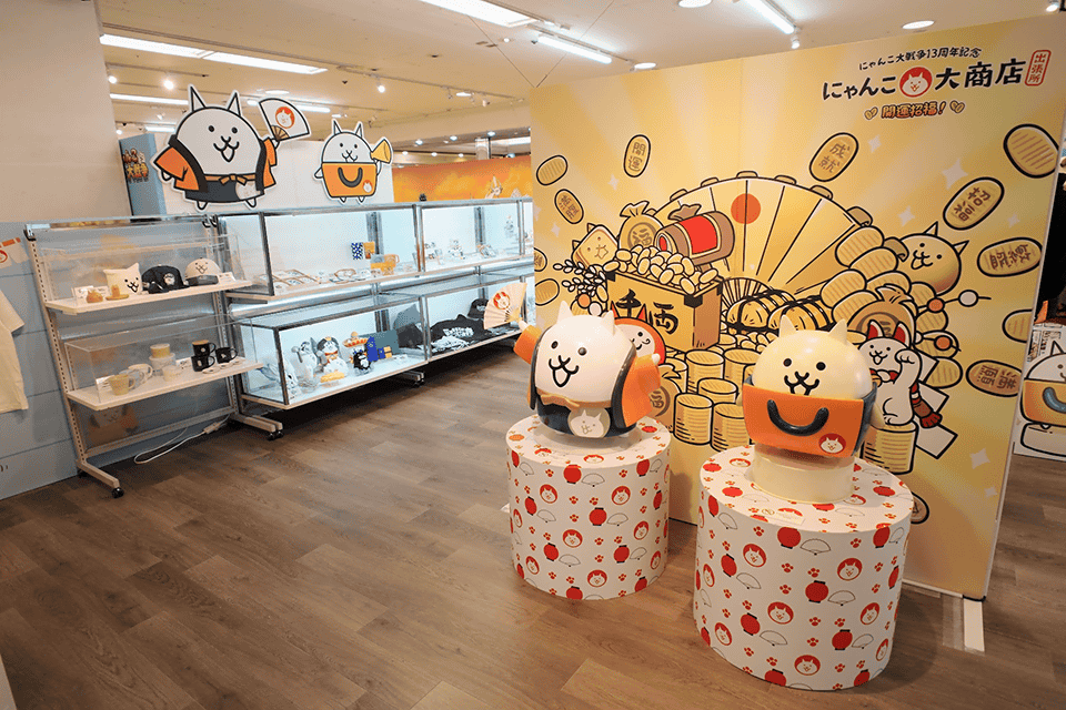 スマートフォン向けゲームアプリ『にゃんこ大戦争』の13周年を記念した本催事では、物販コーナーだけではなく、販売前の商品展示スペースや、ミニゲーム、フォトスポット等、来場者の方々に楽しんでいただけるよう工夫を凝らしたスペースをたくさんご用意しています。