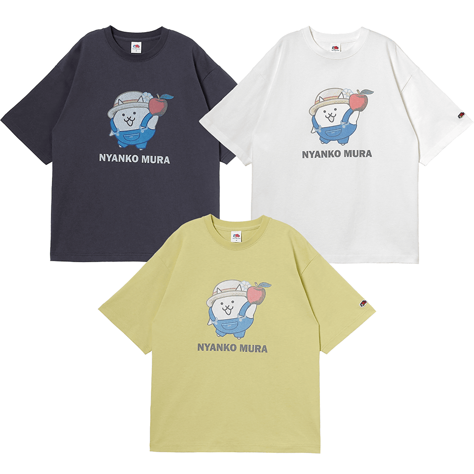今回のコラボレーションでは、にゃんこ村の可愛らしいキャラクターたちが、フルーツオブザルームを象徴する「フルーツ」やフレッシュな「野菜」を手にしたアートワークで登場。着心地の良さと、遊び心あふれるデザインを両立させたラインナップを展開します。