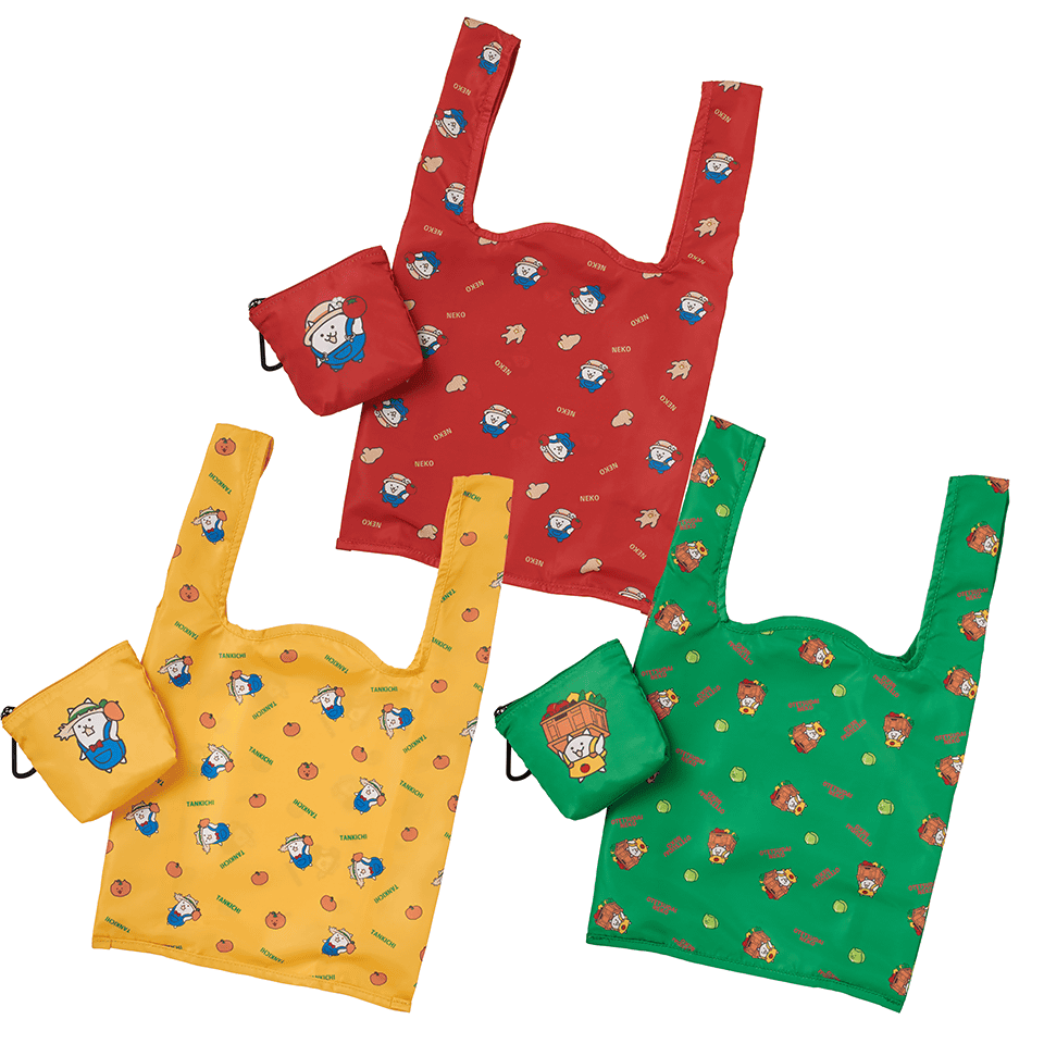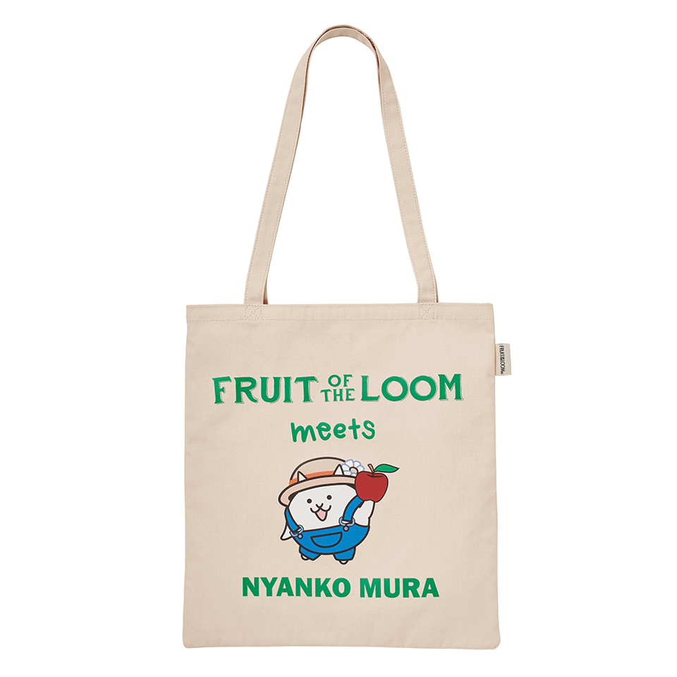 「FRUIT OF THE LOOM meets NYANKO MURA」のロゴが入ったシンプルかつキャッチーな縦型トートと、賑やかな総柄デザインのポーチ付きショッピングバッグ。