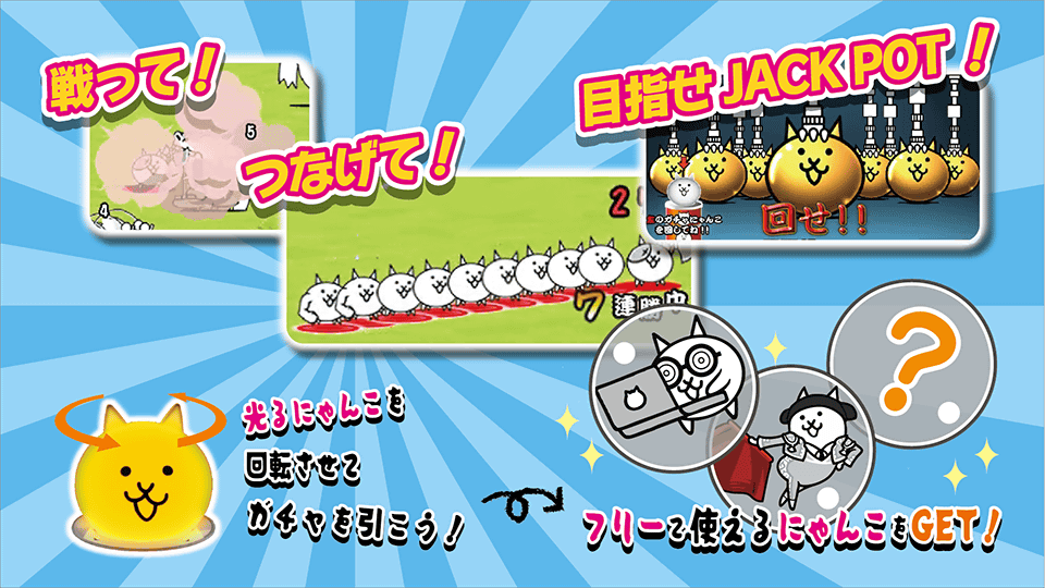 JACKPOT獲得で、最大250枚のクレジットと「10連ガチャ」による強力なにゃんこ軍団獲得のチャンスがあります。