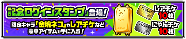 毎日ログインすることで、最大レアチケット10枚、にゃんこチケット10枚ゲット!